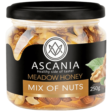 Natūralus Ascania medus su kruopščiai atrinktu riešutų mišiniu – tai sotus, maistingas ir išskirtinio skonio derinys.
